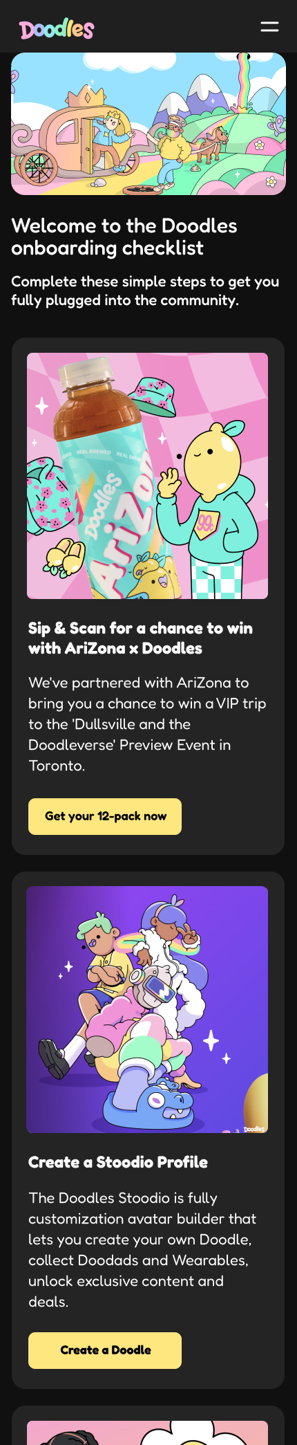 I designed a comprehensive NFT holder hub for the Doodles community that centralizes all key information and interactions in one accessible space. The hub allows holders to easily navigate the ecosystem, access the latest news and event updates, explore IP-related content, and engage with community initiatives. By organizing diverse content into intuitive sections and prioritizing clear, user-friendly navigation, the design ensures that both new and seasoned holders can quickly find what they need, stay informed, and fully participate in the community experience.